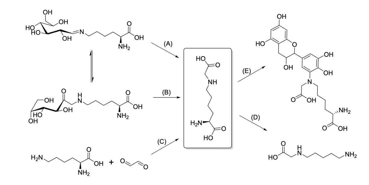Si quieres entrar en la parte más técnica, aquí va la versión completa: la Nε-(carboximetil)lisina (CML) es uno de los compuestos más característicos que aparecen en las etapas avanzadas de la reacción de Maillard. Todo inicia cuando un azúcar reductor entra en contacto con el grupo ε-amino de la lisina presente en una proteína. Este primer encuentro da lugar a una base de Schiff inestable, que rápidamente se reorganiza formando un producto de Amadori. A partir de ahí, la historia química se complica: ese producto intermedio puede oxidarse, bien desde la propia base de Schiff, bien desde el Amadori, o el grupo ε-amino de la lisina puede reaccionar directamente con glicoxal, un compuesto altamente reactivo que puede originarse tanto de la glicación como de la peroxidación lipídica. Cualquiera de estas rutas culmina con la adición irreversible de un grupo carboximetilo a la lisina, sellando así su transformación en CML . En resumen, hablamos de un cambio químico estable, capaz de acumularse en tejidos y servir como marcador de glicación avanzada.