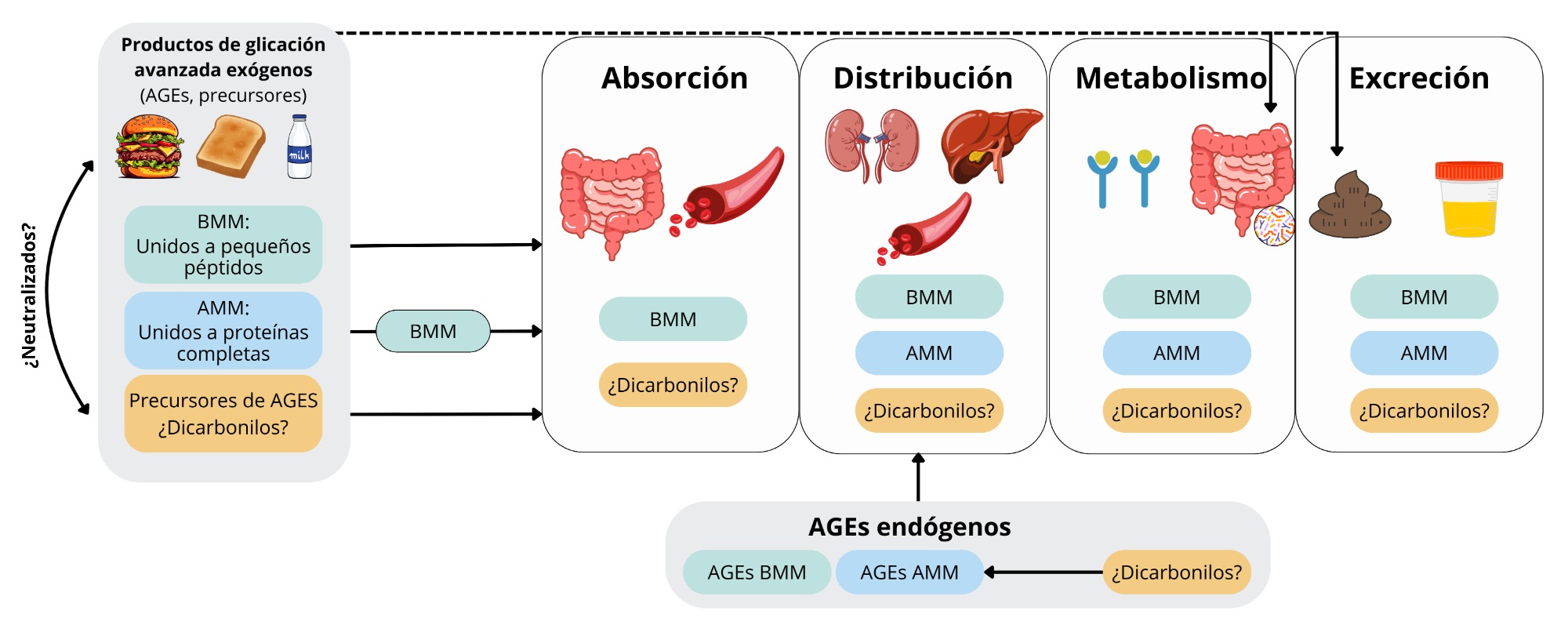En humanos, los estudios sobre AGEs —incluyendo CML— suelen evaluar formas libres de baja masa molecular (BMM) y formas unidas a proteínas de alta masa molecular (AMM). Esta distinción es relevante porque los AGEs HMM tienden a absorberse menos en el tracto digestivo y su detección en circulación probablemente provenga más de producción endógena que de absorción directa. Por el contrario, los AGEs LMM pueden absorberse con mayor facilidad, circular libremente y eliminarse más rápido por orina. Además, una fracción de los AGEs o de sus precursores reactivos puede ser neutralizada o degradada antes de la absorción por enzimas, antioxidantes, microorganismos o reacciones químicas en el tracto digestivo, lo que reduciría su biodisponibilidad.