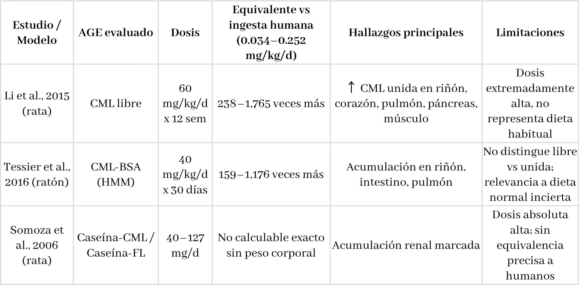 En animales, se han usado dosis de AGEs y CML cientos o miles de veces mayores a la ingesta humana promedio para “forzar” una respuesta y así estudiar su distribución y efectos (tabla 1). Esto permite mapear mecanismos, pero también plantea un problema obvio: la extrapolación directa a la vida real es muy arriesgada. Una buena forma de ponerlo en perspectiva es imaginar que evaluamos los efectos del agua —algo considerado “saludable”—, pero administrando 2 o 3 órdenes de magnitud más de lo habitual: no serían 2 litros al día, sino 100 o hasta 1000 litros en una sola jornada, algo incompatible con la vida. La hormesis, el principio de que la dosis define el efecto, también aplica aquí. Y si pensamos en una sustancia nociva como el tabaco, el exceso sería igual de desmesurado: no sería fumar un cigarro ocasional, sino 100 al día, o incluso 100 cajetillas diarias. Este contraste ayuda a entender por qué los hallazgos de acumulación y daño en modelos animales con dosis extremas no se pueden trasladar de forma directa a la dieta humana habitual.