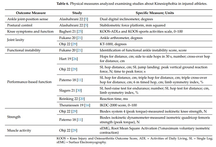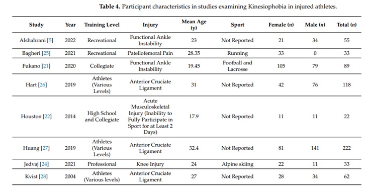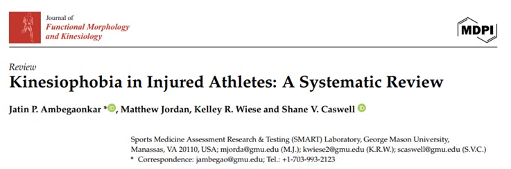 Ambegaonkar, J. P., Jordan, M., Wiese, K. R., & Caswell, S. V. (2024). Kinesiophobia in Injured Athletes: A Systematic Review. Journal of functional morphology and kinesiology, 9(2), 78. https://doi.org/10.3390/jfmk9020078