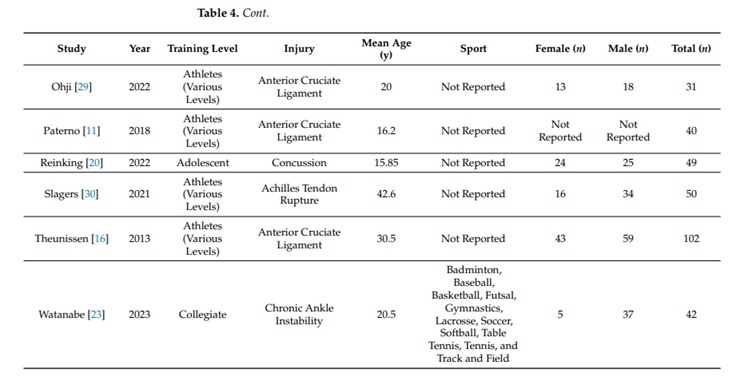 En total se contó con datos de 561 hombres y 432 mujeres que fueron desde atletas adolescentes hasta atletas profesionales de diversos deportes como lacrossse, futbol americano, carrera, atletismo, tenis de mesa y futbol soccer. Las lesiones más comunes incluyeron el ligamento cruzado anterior u otras lesiones de rodilla y de tobillo.