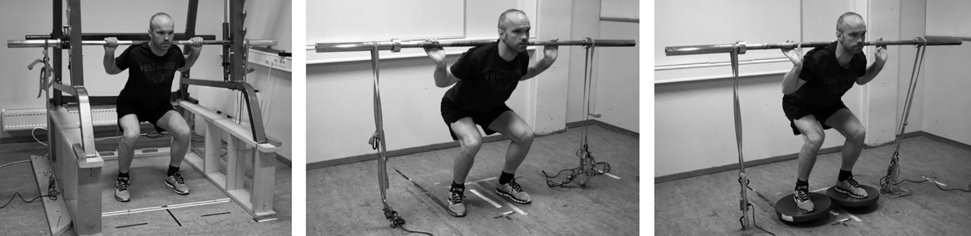 En un estudio reciente de SaeterbakkenI y colaboradores (2023), se reclutaron 59 hombres con experiencia promedio de alrededor de cuatro años en entrenamiento de fuerza. Primero pasaron por 3 semanas de familiarización para reducir el sesgo de aprendizaje motor y, tras esa fase, completaron 7 semanas de entrenamiento estructurado. Los investigadores dividieron a los participantes en tres condiciones bien diferenciadas: sentadilla en máquina Smith (alta estabilidad), sentadilla trasera libre (estabilidad media) y sentadilla trasera libre sobre tablas de inestabilidad (baja estabilidad) (Imagen 2). El volumen se igualó entre grupos y todas las sesiones se programaron con cargas estimadas de 10RM, buscando que cada serie se ejecutara hasta muy cerca del límite de repeticiones posibles manteniendo la técnica.