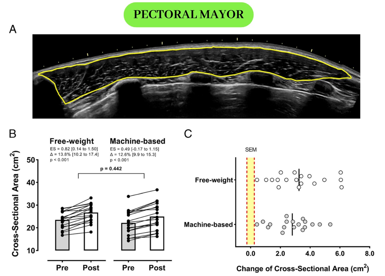 Imagen 3. (A) muestra una imagen representativa del área de sección transversal (AST) del pectoral mayor. (B) presenta los cambios promedio e individuales en el AST tras ambas modalidades de entrenamiento, con intervalos de confianza al 95 % entre corchetes, valores de P debajo para el efecto pre‑post y arriba para la interacción grupo × tiempo. (C) compara los cambios individuales en el AST respecto al error estándar de medición (SEM = ±0.25 cm²), resaltado en amarillo.